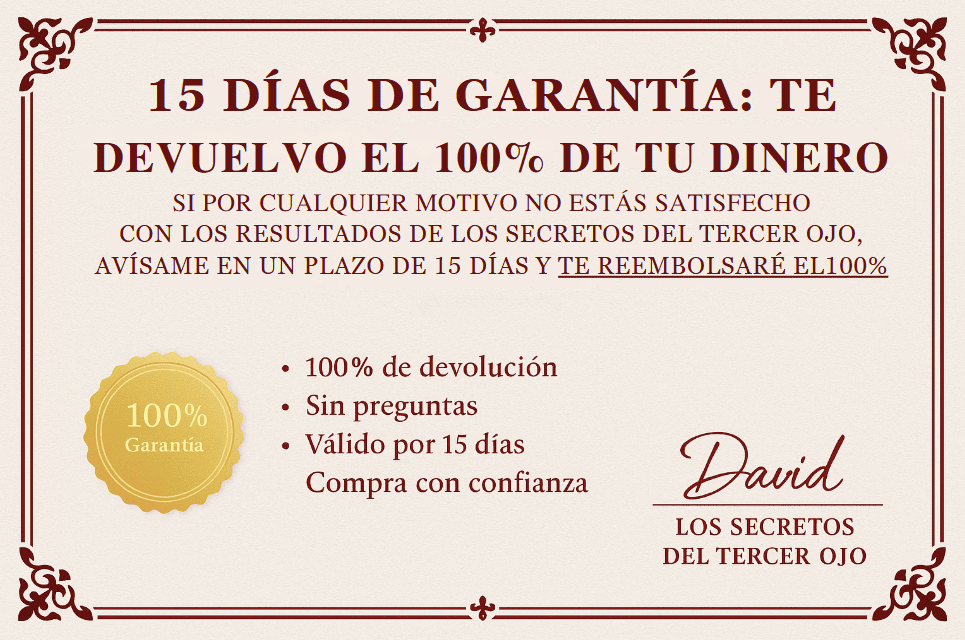 Cuando hoy digas“sí” a Los 5 Secretos del Tercer Ojo , lo haces 100% libre de riesgos. Porque te doy 15 días completos para que decidas si estás satisfecho con tus resultados o no. Si en algún momento durante los próximos 15 días siente que no has visto alguna señal… Simplemente envíe un correo electrónico a mi equipo de soporte y le reembolsaremos el 100% de su inversión inmediatamente.